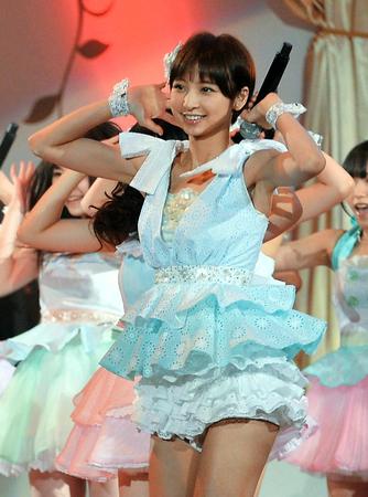 キュートな笑顔でステージに立つ5位の篠田麻里子(撮影・金田祐二)