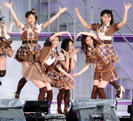 AKB48としての初ステージで元気に踊る塚本まり子(左端)
