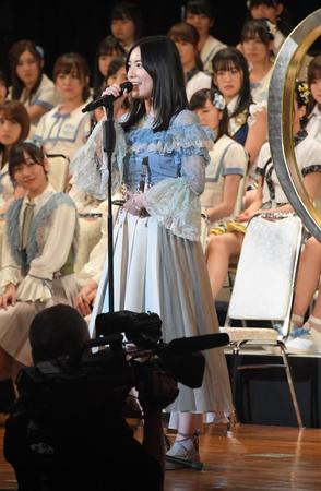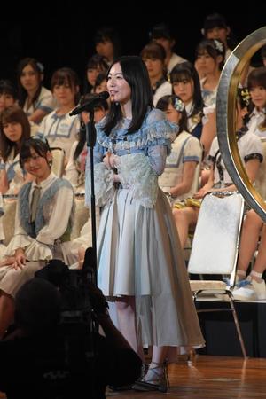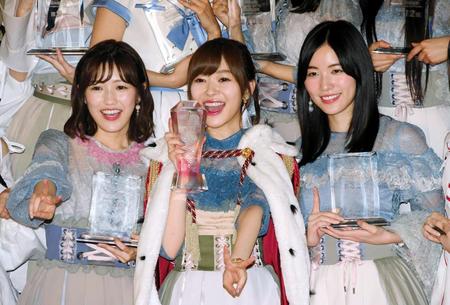 2位で卒業を発表した渡辺麻友(左)、3位の松井珠理奈(右)と一緒に記念撮影に納まる、3連覇を達成した指原莉乃=沖縄県豊見城市立中央公民館(撮影・堀内翔)