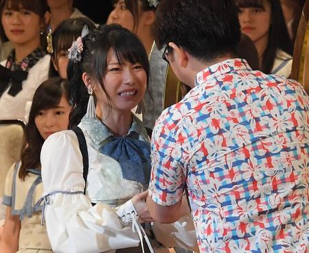 「神7」となり、感極まる7位の横山由依=沖縄県豊見城市立中央公民館(撮影・堀内翔)