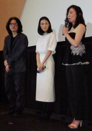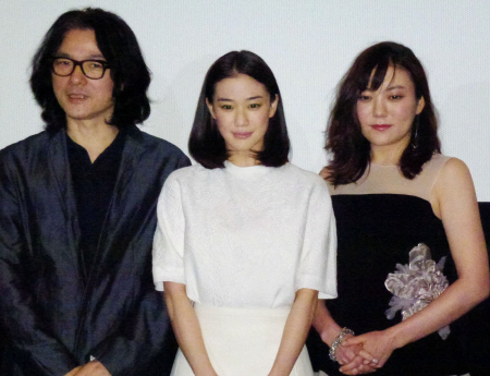 女優の蒼井優(29)と鈴木杏(27)が12日、都内でアニメ映画「花とアリス殺人事件」(20日公開)の完成披露舞台あいさつに岩井俊二監督(52)とともに登場した。