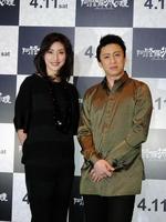舞台あいさつを行った天海祐希(左)と市川染五郎=東京・新宿