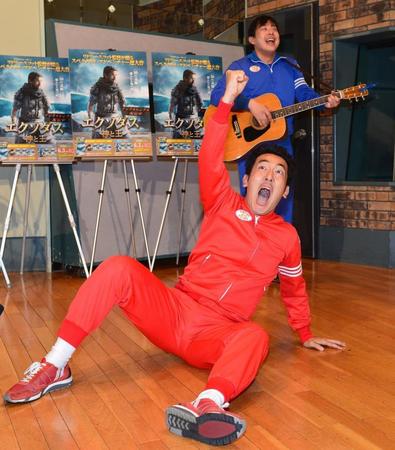 とにかく何をやるにも全力だ。この日はお決まりの「なんでだろう」に続いて、映画宣伝バージョンを披露。10台近く並んだテレビカメラ1台1台に向かって、「♪エクソダス~エクソダス~」と動き回りながらPR。さらに、音が入らないスチールカメラに向けてまで歌い続けたのだ。汗だくなりながらギターを弾くトモと、おもしろ顔で動き回るテツのコンビネーションに、場内は大爆笑に包まれた。