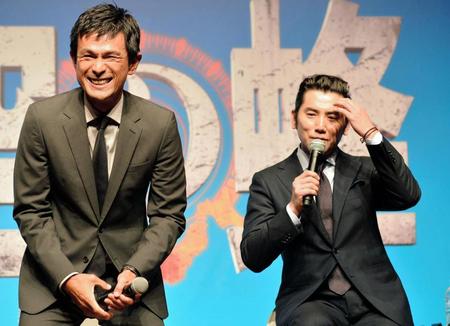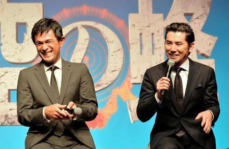 俳優の江口洋介(47)が22日、都内で、主演映画「天空の蜂」(9月12日公開)の完成報告会見に、本木雅弘(49)、仲間由紀恵(35)らと登場した。人気作家・東野圭吾氏(57)が1995年に発表した同名サスペンス小説が原作。超巨大ヘリを悪用した原発テロを軸に、親子のキズナも描かれている。