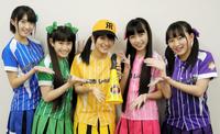阪神グッズを身につけ気合を入れる、たこやきレインボーの春名真依、根岸可蓮、清井咲希、彩木咲良、堀くるみ(左から)