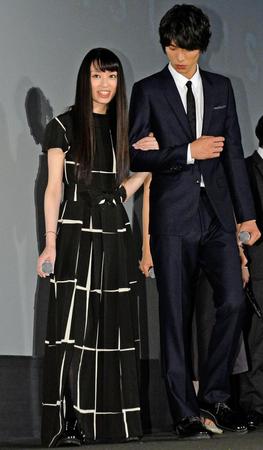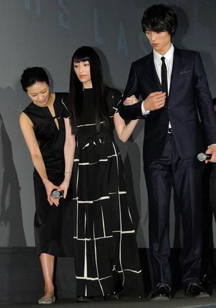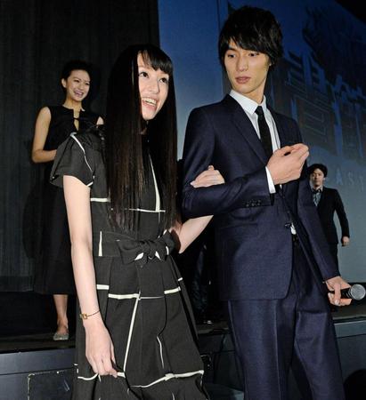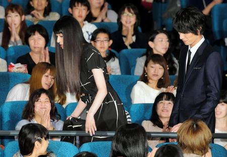 主演のV6・岡田准一(34)らは劇場後方からの姿を見せたが、栗山とエスコート役の福士蒼汰(22)だけはステージ横からの登場。すでにギプスを外し、普段は松葉づえで移動しているが、福士の腕に手を絡ませ、ゆっくりと階段を上った。