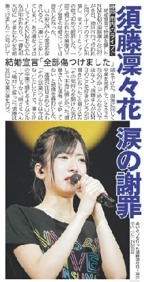 NMB48の須藤凜々花(20)が6日、神戸市内で行われたNMB48のライブ「サササ サイコー」に出演し、アンコールで「大切にしてきたものを傷つけました」と涙ながらに6月に行った“結婚宣言”を謝罪した。須藤がNMB全メンバーの前で謝罪を行うのは始めて。