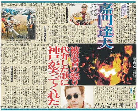 神戸のホテルで激震に見舞われた歌手の嘉門達夫(55)は、1カ月後に再び神戸に入り、“被災者の怒り”を歌に込めて避難所に笑いを届けた。自身のチャリティー活動の原点となった体験を踏まえ、これからの神戸へエールを送った。