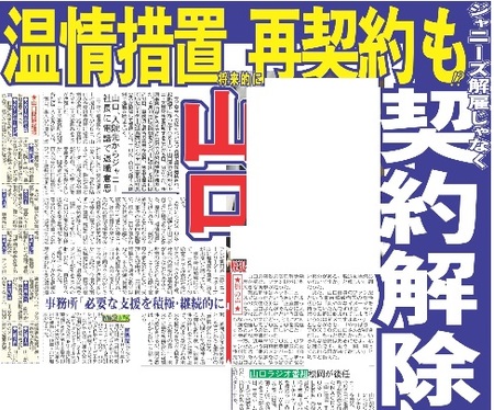 23年にわたりTOKIOとして活躍した山口を育てた立場であることから、異例の“温情措置”も付けられた。「契約を解除することとなりますが、事件の社会的な影響や、現在、山口が置かれている状況などを鑑み、彼を育ててきた立場として、社会に責任を果たすために必要な支援を今後も積極的かつ継続的に行って参る所存でございます」と宣言。解雇ではなく、契約解除とした。