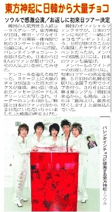 韓国の人気男性5人組コーラスグループ、東方神起が12日、韓国・ソウルオリンピック公園第一体育館で初のコンサートを行った。公演には、メンバーに直接、バレンタインチョコレートを届けるため、日本から120人のファンが駆けつけ、その人気ぶりを示してみせた。