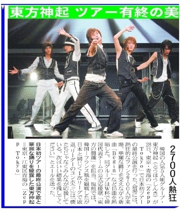 韓国の人気5人組グループ・東方神起(とうほうしんき)が28日、東京・青海の「Zepp Tokyo」で日本初ツアーの最終公演を行った。会場には、熱狂的なファン2700人が来場。華麗な踊りを交えながら新曲「Begin」など15曲を熱唱した。同グループはW杯で韓国代表チームの公式応援歌「東方の闘魂」を担当。現地では、韓国―フランス戦を観戦したが日本と同じく1次リーグで敗退。リーダーのユンホ(20)は「僕たちじゃなくみんなが応援している。次はいい結果を残してください」とエールを送った。