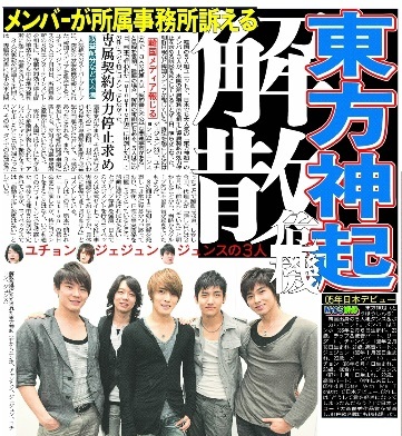 東方神起は今月21日に予定されていた中国公演を中止。23日には、ソウルで行われた音楽賞に事務所と対立している3人だけが出席。「もしかして見ているかもしれない人(ユンホ、チャンミン)に愛してると言いたい」とステージで呼びかけた。授賞式への不参加を宣言した所属事務所に反旗を翻しての強行出席に、もはや関係修復は不可能という見方も強まっている。