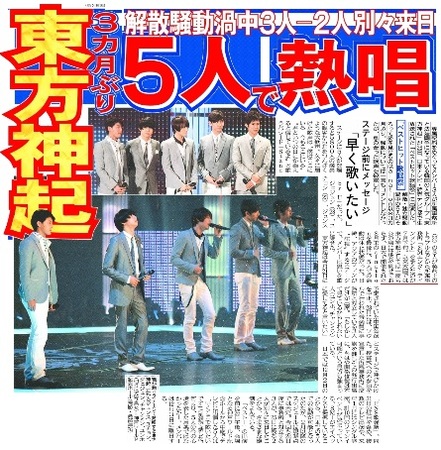 専属契約をめぐってメンバー3人が所属事務所と法廷闘争になっている韓国の人気グループ「東方神起」が26日、日本テレビ・読売テレビ系で生放送された「ベストヒット歌謡祭」に出演した。解散・独立騒動渦中の5人がそろって姿を見せるのはa―nation以来3カ月ぶり。