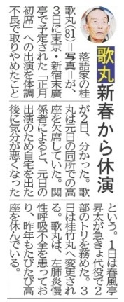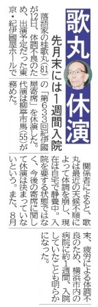 関係者によると、歌丸は今月12日午前3時ごろ、自宅で息苦しさを訴え病院に救急搬送された。誤嚥性肺炎と診断され、そのまま19日までの予定で入院した。病院の処置で症状は治まったが、大事をとって結局22日まで、入院治療した。