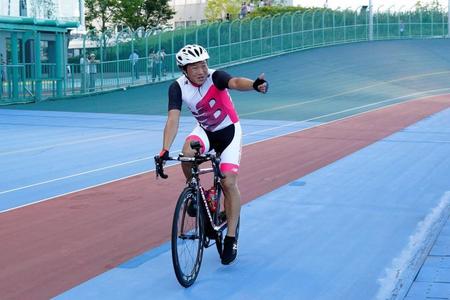 みやぞん(33)は午後8時過ぎ、2種目目のバイク(自転車)、60キロを完走した。ゴールでは右手を高々と掲げ、ガッツポーズ。