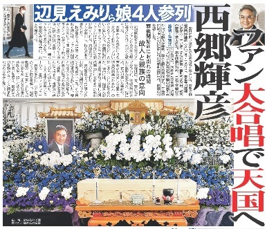 棺が霊きゅう車に乗せられる際には、ファンが西郷さんの大ヒット曲「星のフラメンコ」やデビュー曲「君だけを」を涙ながらに大合唱。出棺時には「西郷~!」という悲痛な叫びや「輝ちゃん今までありがとう!」と感謝の声が飛び交い、故人を見送った。