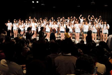 被災地でのミニライブに参加している山本彩(21)、渡辺美優紀(21)らを除く53人がそろいの白いTシャツにショートパンツ姿で登場。「ポスト山田菜々オーディション」に合格した植村梓(16)も劇場デビューを果たし、関西のファンとともに丸4年を迎えた被災地に向けて大阪からエールを発信した。