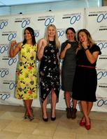 写真に納まる(左から)ナターシャ・ハンセン、ステファニー・モートン、ロリーヌ・ファン・リーセン、アナスタシア・ボイノワ=東京都千代田区のJKA(撮影・中田匡峻)