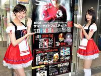 別府競輪で開催中の九州ビアフェスティバルでビアガールを努める山田舞さん(左)、瑞木ティナさん
