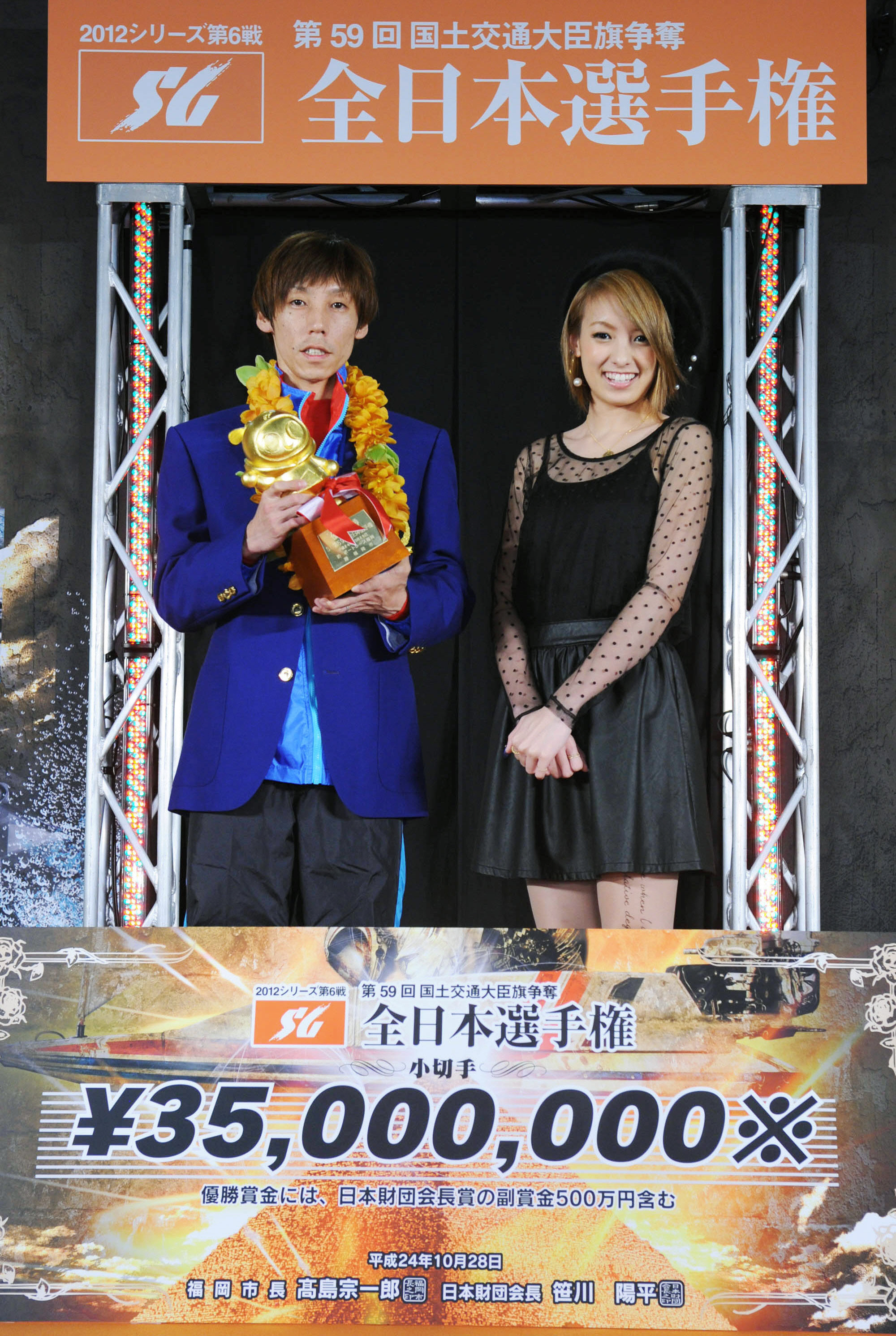 2度目のSG優勝を果たし、タレントの南明奈に祝福される丸岡正典(左)