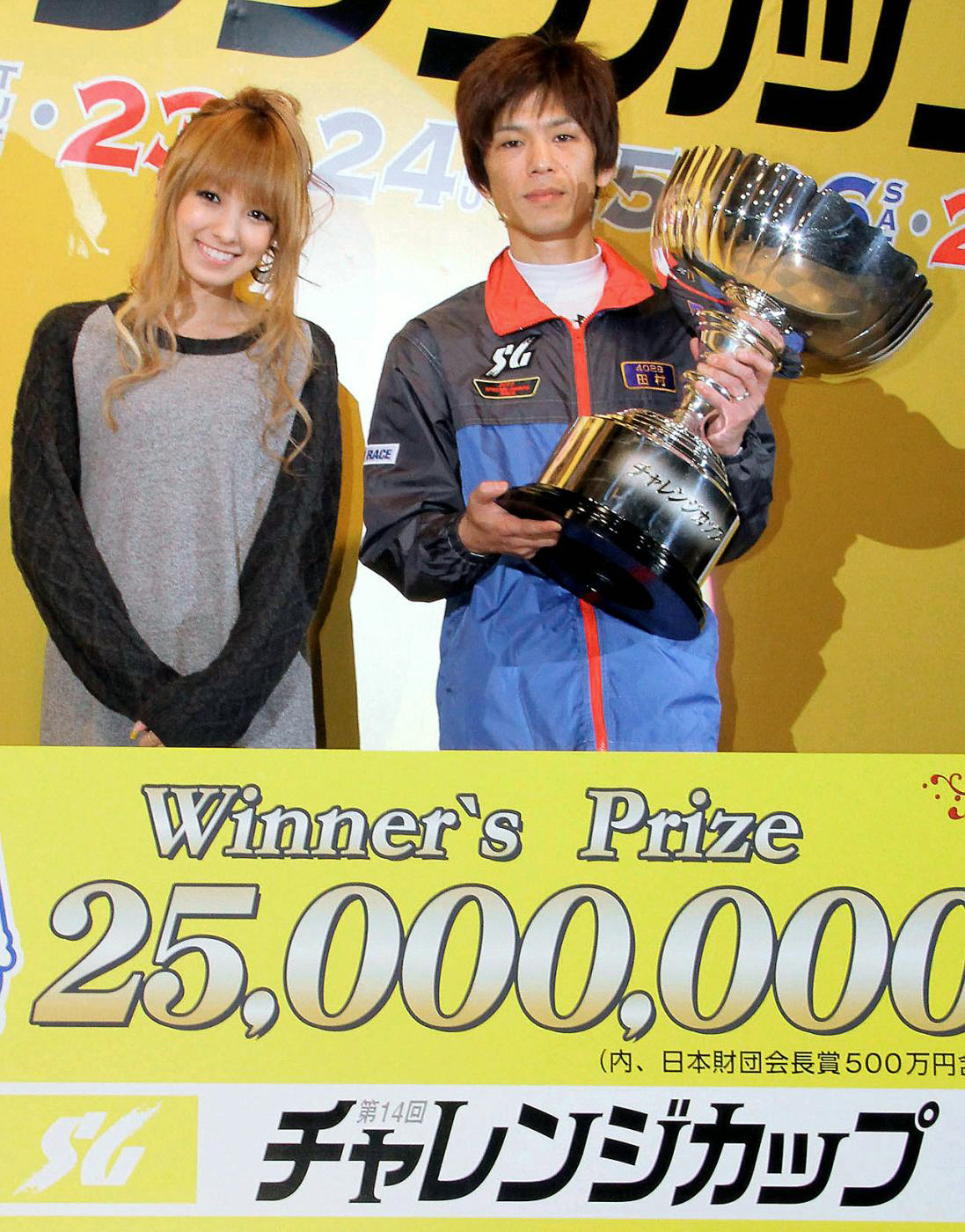 モーターボートイメージガールの南明奈(左)に祝福される田村隆信