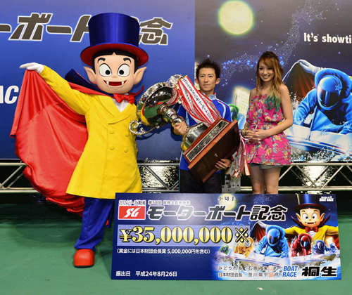 ウイニングランで使う黄金のボートに乗って走る姿も、MB記念覇者に送られる総務大臣杯を手にする姿も、もう慣れたもの。瓜生は、桐生SGと、MB記念の連覇を同時に成し遂げた。「初優出も、SGに初めて出たのも桐生。何となく、いい印象をもたせてもらってます」と水面相性の良さを実感していた。