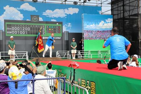 選手紹介を前に元プロ野球選手の立浪和義氏、片岡篤史氏が始球式を行い、立浪氏は「甲子園みたいで良かった」と絶賛。片岡氏は「ボールが柔らかくてどうかと思ったが、いいところに投げてくれた」とPL学園の同級生でキャプテンだった立浪氏をたたえていた。