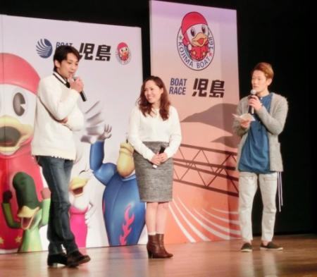ボートレース児島で12日、第5&9レース発売中にイベントホールにて、オートレーサーの森且行&佐藤摩耶と、昨年のグランプリ覇者である茅原悠紀がトークショーを行った。