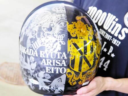 浜田のヘルメットには天使、エンブレム、エジプト王、紋章など神秘的なものが数多く描かれている。新しいヘルメットの模様を考える際に、デザイン集を参考にしようと表紙を見たとたんに、一目ぼれ。「かっこいい」と、迷うことなく採用した。「今でも飽きることはなくすごく気に入ってます」とヘルメットに熱い視線を向ける。実はこの模様は前回から変わってはいない。「考えるのがめんどくさいこともありましたが、それ以上に好きで変えたくなかった」と思い入れは深い。ヘルメットの後頭部の辺りには、ローマ字で夫で同じボートレーサーの中田竜太(34)=埼玉・104期・A1=の名前と、自分の名前そして子供の名前を入れている。「大切にしたいので」と家族への強い思いが込められている。