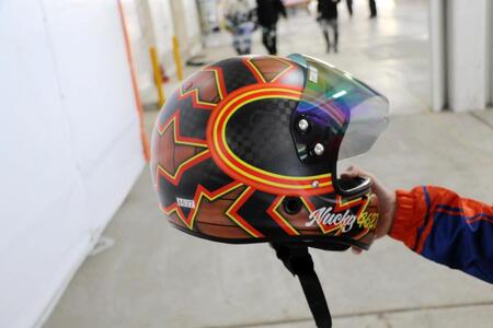現在のヘルメットは「太陽と月をテーマにしました。木目調の落ち着いた感じに太陽。ネットで見つけて、そこからいらないのを省いていってこのデザインになりました」となかなかの力作。「太陽が好きなんですよ。カッパもそうだし、ネックレスもです」と太陽にこだわり「雨の日って嫌じゃないですか。やっぱり晴れの日がいいし好き。しばらくはこの感じで行きたい。ファンも太陽をイメージしたものをプレゼントしてくれているので、レース場では使わせてもらってます。ありがたいです」とニッコリ笑っていた。
