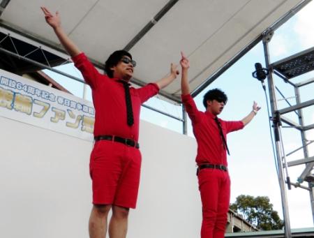 おなじみのサングラス姿で屋外ステージに立った、はまやねん(23)と田中シングル(23)のコンビはあまりの寒さに「お客さん、誰かダウンジャケット貸してくれませんか?」と半袖の衣装に震えながらもステージを敢行。小さな子ども連れの家族も多く詰めかけたなかで“ラッスンゴレライ”と“お弁当”の2つのネタを勢いよく展開して大盛り上がりとなった。