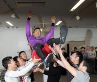 12R決勝を制し、優勝した武田豊樹は、カップを手にガッツポーズを見せる=松山競輪場(撮影・北村雅宏)