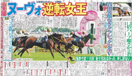 2番人気ヌーヴォレコルトが断然の1番人気ハープスターの猛追を封じて樫の女王に輝いた。騎乗した岩田は、史上7人目となる5大クラシック完全制覇を成し遂げた。首差2着にハープスター、3着には3番人気バウンスシャッセが入った。