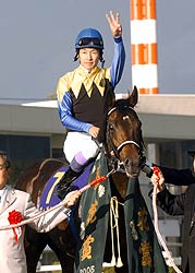 単勝は元返しの1・0倍。お守り代わりに買った人もいるだろう。大きな期待に応えた。 「落とせないレースだった。3冠は騎手として誇れること。自慢できること」。武豊は馬上で3本の指を高々と掲げた。 3冠伝説最終章は、思わぬ好スタートから始まった。1周目の坂越え。行きたがる面を見せ、いつもより前の位置で運ぶと、ラチ沿いの7番手でやっと折り合った。向正面を過ぎ、2度目の坂越えを乗り切ると、残り550メートルを合図にユタカがGOサイン。 先行するアドマイヤジャパンを捕まえられるのか。杞憂(きゆう)だった。「また飛んでくれましたね」とユタカ。これまでにないほどの必死のムチに応えた上がりは33秒3と、いつもの衝撃波だ。ゴール100メートル手前で捕らえると、並ぶ間もなく差し切った。