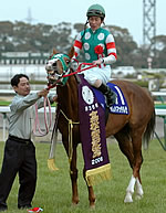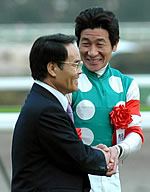 【短距離界に新王者】 ムチの嵐が飛ぶ馬群の中を、力強い脚取りで栗毛のボディーが割って出てくる。初めての6F戦こそが、ようやく見つけた得意舞台だった。持っている全ての力を振り絞って、オレハマッテルゼが大歓声の待つG1ゴールに飛び込んだ。まさにみんなが待っていた初タイトル。短距離界に新王者が誕生した瞬間だった。 検量室前では音無師が握手攻めにあっていた。「おめでとうございます!」の声が四方八方から飛ぶ。調教師として開業してから12年目。ようやくつかんだ初G1の美酒だ。「長かったですからね。チャンスがなかったわけじゃなく、チャンスがありながら、なかなか勝てなくて…」としみじみと余韻に浸る。昨年、一昨年の天皇賞・春では、リンカーンが1番人気に推されながらも栄冠には届かなかった。一昨年、リーディングトレーナーの座を手にしても、G1には縁のなかったトレーナー。しかし、晴れて頂点の座をつかむことができた。