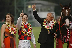 馬を信じた。レース前にジャニアック師との作戦会議では、サイレントウィットネスの先行は念頭になかった。それでも「自分のレースに徹すると決めていたから動揺はなかった」とフォード。直線に入って満を持してアクションを起こすと、一瞬のうちに2馬身ほど前に躍り出る。あとは弾丸の伸び脚で真一文字にゴールを目指し、その差は少しも詰まらなかった。 「ペースが速いことは分かっていたから、直線では後ろから来る馬が頭から離れなかった。でもゴールが近づけば近づくほど馬が強くなる感じがした」。テイクの底力に改めて驚かされた。 これでGSCのシリーズ3勝目。アウエーの勝利で2倍の20点を獲得し計53点で、ぶっちぎりの優勝を決めた。12月に行われる最終戦の香港スプリントを制すれば、4カ国に参戦して3カ国でGI3勝以上という過酷な条件を満たして100万ドルのボーナスが支給される。まさに夢の途中だが「一番いいときの姿を自分自身見ることができ、また皆さんに見せることができたことが何よりうれしい」と愛馬を称えた。 まだあどけなさの残る22歳の若武者。「僕の人生を変えてくれた特別な馬。世界に通用する素晴らしい才能」。夢の超特急との旅は、終着駅を知らない。 【タクシー運転手・ジャニアック師笑顔】 勝利のワイングラスを右手で揺らしながら、オーナーでもあるジャニアック師は穏やかにほほ笑んだ。「前走に比べて、今回は順調にこれたし、すばらしいレースができた。110%の競馬。馬は能力を100%出してくれたし、あとの10%はスタッフのおかげ」。まさに人馬一体、その厚い信頼感の上に築き上げられた歓喜のVだった。 03年のセリで1250豪ドル(約11万円)で購買された馬。「ヒザが悪かったので手元に置いておいた。だけど磨いてみたら光った。さらに磨いたらもっと光った。お金を目的でやってきたわけじゃないし、ただベストスプリンターを目指してやってきた結果だよ」。想像を超えた愛馬の出世ぶりに目を丸くした。 タクシー運転手をしている師と11万円馬のサクセスストーリー。「馬体の回復を見ながら、次回も頑張りたい」。香港ではさらなるビッグボーナスが待っている。 【メイショウボーラー 粘った2着】 テイクオーバーターゲットには歯が立たなかったものの、2着に粘ったメイショウボーラー。「スタートは良かったけど、外から来られたので控える形に。ペースはそう速くなかったし、いい形で進められたね。雨が降って下が軟らかくなってくれたのも良かった」。福永は、力を出し切り満足げな表情を浮かべた。白井師も「勝ち馬が強すぎた。でも賞金を加算できて今後が楽しみになったよ」と笑顔で競馬場を後にした。 【タガノバスティーユ3着 大波乱呼んだ】 3連単は260万馬券。最低人気の3歳馬タガノバスティーユが大波乱の使者となった。インをロスなくさばいた勝浦は「冷静に乗れました。前が残る流れでしたから、展開が向いたわけではないでしょう。狭いところを割って出て来られましたしね。3歳馬でこれだけやれるんですから、すごい馬ですよ」と予想以上の好走に目を丸くしていた。 |