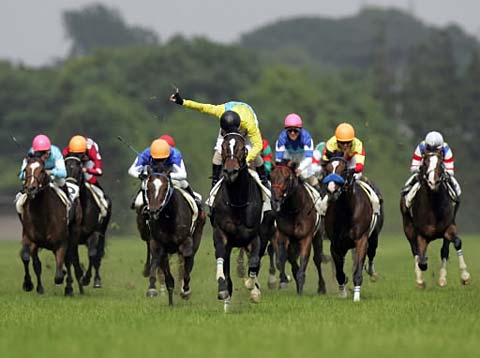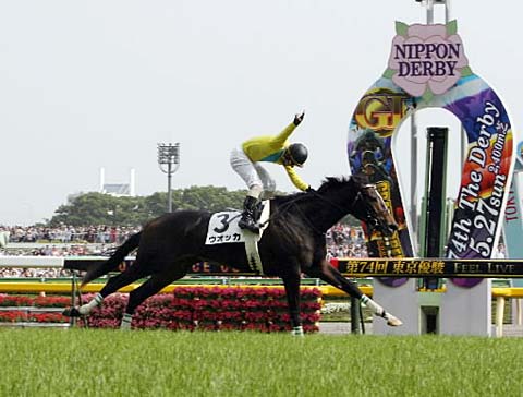 歓喜の輪の中で、谷水雄三オーナーの笑顔が開いた。「なんて言ったらいいのか…なかなか言葉が出てこない。いやあ、うれしいですね」。ウオッカの父タニノギムレット(02年)に続いて2度目のダービー制覇は、タニノハローモア(68年)、タニノムーティエ(70年)で、やはり2勝の父・信夫氏に並んだ。 「枠順が決まった時に、縁起めいたものを感じました。ギムレットも(3)番だったからね。ギムレットの初年度産駒で、しかも牝馬で勝たせてもらえるなんて…夢のようですよ」。ダービー挑戦は角居師の強い希望があった。「彼の熱い熱意を感じたので、ちゅうちょはなかった。(抜け出すのが)早いかな思ったけど、よく頑張ってくれた」と愛馬をねぎらった。 安倍晋三首相から内閣総理大臣賞を授与されると「ギムレットの時は小泉総理がいらしてくれたし、これって、すごい強運ですよね」とホオをほころばせた。気になる今後だが「終わったばかりだし、今夜ひと晩寝てから、ゆっくり考えることにします」。今はただ、ダービー勝利の余韻に浸るばかりだった。 ▼投票は得意? 安倍首相夫妻で的中 内閣総理大臣賞授与のため、安倍晋三首相が昭恵夫人とともに東京競馬場に来場した。内閣総理大臣の観戦は02年の小泉純一郎前首相以来3度目のことで、安倍首相の祖父である岸信介元首相が最初だった。 安倍首相はウオッカの複勝、昭恵夫人は単勝を購入。夫婦そろって的中した。「東京競馬場の美しさには本当に驚きました。競馬はテレビでしか見たことがないのですが、ライブで見ると、迫力があって気分が高揚しました。馬券は家内に倣って買いました」と感動していた。 【キングス銀!!また大荒れ!!3連単215万馬券】 またユーイチかと場内はどよめいた。軽快に逃げるアサクサキングスの勢いは、直線に入っても止まらない。オークスに続き、福永の2週続けてGI勝利かと思われたが、矢のように伸びてきたウオッカに差されて2着。14番人気の伏兵は、3連単200万馬券を演出した。 「直線で抜け出した時に凄い勢いで外からウオッカが伸びてきた。2着を死守しなれけばならないと懸命に追ったよ」と福永。3馬身差の2着だが、立派な銀メダルだ。大久保龍師も「力が入ったね。一瞬やったと思ったが、やはり甘くなかったね」と悔しそうに語った。 皐月賞7着、NHKマイルC11着とGIでひと息の成績が続いていたが、未知の二千四百メートルで鮮やかな競馬を見せた。「この後は馬の様子を見ながらになるが、宝塚記念(6月24日・阪神)へ向かおうかと思っている」とトレーナーは次なる目標を掲げた。次は古馬を相手に痛快な逃走劇を見せる。 【ホウオー完敗7着】 ▼折り合い欠いて末脚不発 スタンドを揺るがす大歓声もむなしく聞こえるだけだった。残り三百メートル、安藤勝の右ムチが打ち込まれ、フサイチホウオーは内側のローレルゲレイロに馬体を合わせながら追い上げを図る。しかし、前を行く馬との差は詰まらない。上がり3Fは34秒1。ただ、待っていたのは7着止まりのゴールだった。 大舞台、逆襲をかけた一戦だからこそ、抑え切れなかった闘争心。「イレ込みが激しかった。引っ掛かった」。主戦は渋い表情を残した。ゲートがあいて中団につけたが、発走前から荒々しかったホウオーが折り合えたのは、ようやく向正面を過ぎてから。「もう少し伸びてもいいんだけど。4コーナー手前で反応しなかった」。余分にあふれた闘志が、最後に足かせになったのは動かぬ事実だ。 02年タニノギムレット、04年キングカメハメハ。現役最多タイのダービー2勝を誇る松田国師にも悔しさがにじむ。単勝1・6倍の圧倒的1番人気。3度目のVを逃し、その目はかすかに潤んでいた。「アンカツさんはコースロスなく乗ってくれた。““仕上げる≠ニいうのは““掛かる≠アとと紙一重。プロセスは順調だったが、乗り越えられなかった」と肩を落とした。 勝ち馬と同タイムで3着に敗れた皐月賞に続き、2冠目もVには届かなかった。今秋の凱旋門賞への挑戦プランについて「今どうこう言うべきじゃない。まずは、きちっと管理下に置いて馬の状態を見たい」と、トレーナーは明言を避けた。「ファンに申し訳ない」と頭を下げる姿が、勝者と敗者の明暗を映し出していた。 【ヴィクトリー痛恨出遅れ9着】 ▼一瞬で消えた2冠の夢 13万人の観衆が見守るスタンド前のスタート地点。皐月賞馬のヴィクトリーは、一瞬ひるんだような格好で痛恨の出遅れ。1コーナーを回った時は誰もが予想しなかった最後方からの競馬になってしまった。 「ゲートをうまく出れなかった」と田中勝は振り返る。そこから折り合いを欠きながら一気に4番手まで進出。直線では鞍上のムチに応えることなく9着に沈んだ。「前半で走っちゃったからね。ケツで折り合いをつけようとしたが、うまくいかなかった」と日本、海外のGIを制したジョッキーは悔しそうに語った。 皐月賞もスタートは良くなかったが、先頭に立ってから折り合い、スムーズなレースができ