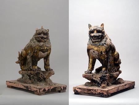 獅子・狛犬といえば、「あ・うん」の形相で、通常は参道の両脇でよく見られますが「春日大社」では、非公開の神域をお護りするため、古くより御神前に獅子・狛犬を奉安。今回、初めて公開される4対8躰は、調査の結果、そのうち6体が鎌倉時代の作。木製寄木造、漆地に金箔を押し彩色されていること、平安風の面影を残す穏やかなフォルム、渦を巻く毛先や顔の向きなどの様式から、800年前の制作とされる。なかには、獅子と狛犬の配置が通常と左右逆で、狛犬の後ろ足も立ち上がった珍しいものもあり、いずれも歴史的・美術的に極めて貴重な宝物であることが明らかに。