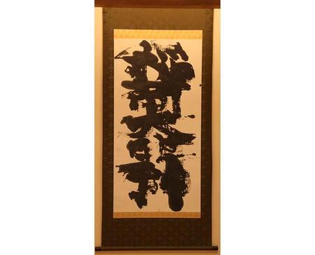 1960年に第11代藤巻宮司が、20世紀を代表する木版の巨匠・棟方氏に依頼した掛け軸。通常は参拝者の目に触れない社務所内「正庁の間」に掛けられています。今回の初公開では、高さ140cm×幅70cmの掛軸からはみ出さんばかり、棟方志功独特の雄大かつ墨痕鮮やかな筆致から、その迫力を感じ取ることができるでしょう。