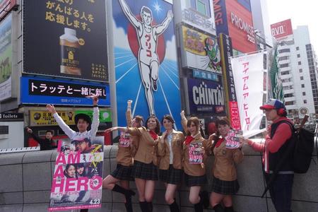 花沢健吾の人気コミックを実写化した映画『アイアムアヒーロー』が4月23日に公開されることを記念し、大阪・道頓堀に16日、作中に登場する謎の生命体「ZQN(ゾキュン)」に扮した女子高生が出現。ゾキュンになれるボディシールを配りながら、心斎橋を練り歩いた。