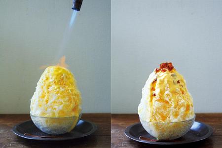 氷にのせた砂糖をそのままバーナーの炎で炙ってキャラメリゼする、衝撃のクリームブリュレかき氷! 一瞬で甘く芳しい香りが鼻孔を刺激。生クリームと卵黄で作るコク深いクリームは味わいだけでなく、ぽってりとした柔らか具合も絶妙。目の前でパフォーマンスしてくれるので、大興奮間違いなし。