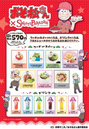 従来の食べ放題のメニューにプラス570円で、オリジナルコラボメニューを提供。「おそ松特製いちごパフェ」や「カラ松の恵方巻き」「チョロ松のまともな抹茶あんみつ」「一松とエスパーニャンコの本音ワッフル」「十四松の肉布団」「トッティーのリア充生ハムサラダ」「イヤミピザ」といった六つ子&イヤミらしいフードと、それぞれのカラーに合ったドリンクが楽しめる。
