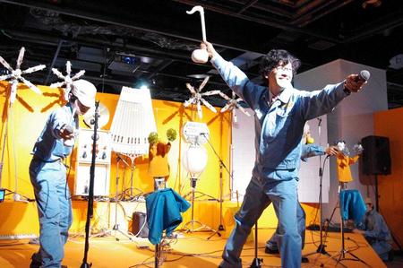 オタマジャクシ型の楽器「オタマトーン」や魚骨型電源用延長コード「魚コード」など、ユニークな玩具を開発するアートユニット・明和電機。このたび、20年ぶりとなる大阪での個展『明和電機 ナンセンスマシーン展』が、6月10日から「ナレッジキャピタル EVENT lab.」(大阪市北区)でスタート。初日、メンバーの土佐信道(社長)がパフォーマンスに登場した。