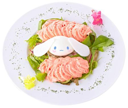 シナモンが大きな耳をパタパタさせて空を飛ぶことから、「ピンクのふわふわ雲 トマトクリームパスタ」、ブルーに彩られた「遠いお空のブルーストロガノフ」など、見た目も驚きのフードメニューがずらり。ほか、和の食材を用いる高級イタリアンの有名店「祇園やまぐち」の山口正シェフが考案したという「シナモンとアズキのまっちゃり会」「あま~い京のおとうふどすえ」など京都らしいスイーツも登場する。