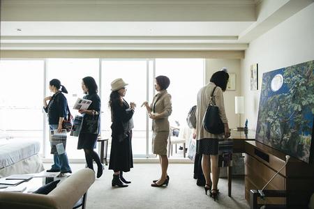 ホテルの各部屋ごとにギャラリー、画廊が出展。現代の巨匠だけでなく、若手作家の発掘にも力を入れている神戸の「川田画廊」をはじめ、京都の「同時代ギャラリ-」、東京の「銀座かわうそ画廊」が名を連ねるほか、なかには、山田芳裕『へうげもの』(週刊モーニング連載中)スピンオフユニット「激陶者集団 へうげ十作」、日本一の酒どころ・灘五郷の銘酒が堪能できる「ART meets SAKE」なんて部屋も。ホテルのワンフロアを往来しながら、バラエティに富んだアート(とお酒)が楽しめるというわけだ。