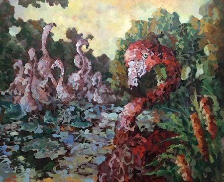 長田さんは2011年に慶應義塾大学の美学美術史科を卒業。それから2014年までの約3年間、アメリカの大学で油絵を専攻し、現在は東京を拠点に活動している。幼い頃から、日本舞踊や書道を学んできた彼女の作品は、大胆な筆遣いとリズムのあるタッチ、そして、目を惹く色彩が特徴で、まるで生き物のような躍動感がなによりの魅力だ。