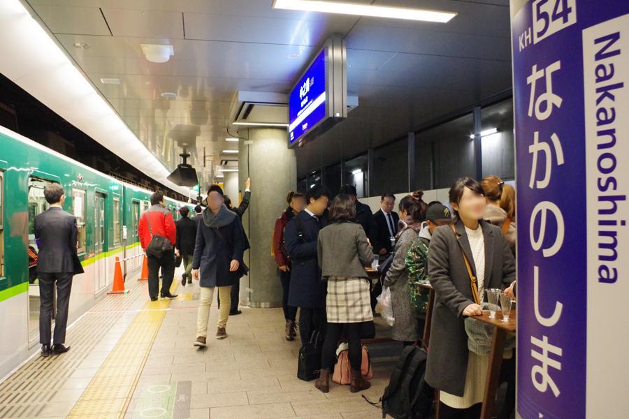 京阪・中之島駅が酒場に、つり革片手に女子会も