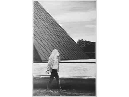 三宅はフォトグラムという、カメラを使わずに被写体の影を焼き付ける写真技法を用いているアーティストです。作品は、スナップ写真をもとにモノクロ反転したネガの絵を描き、その絵をコンタクトプリントして作られています。写真であり絵であり、そのどちらでもないような不思議な雰囲気と、見る者の記憶に強く働きかける作用が特徴です。