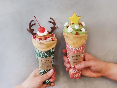 高槻で行列ができる人気カフェが展開するクレープ店「ROCCA & FRIENDS CREPERIE」(大阪府高槻市)では、2種類のクリスマスクレープを展開。トナカイの角が魅力的な「トナカイプリン」1080円(写真左)は、ミルクティークリームと自家製プリンの下に、キャラメリゼしたほろ苦いリンゴとラズベリーが入る。まるでツリーのような「グリーンティーツリー」1180円は、抹茶クリームの中にいちごをまるまる1個入り、ラフランスと柚子のジャムがアクセントに。期間は12月19日から25日まで。