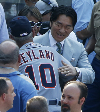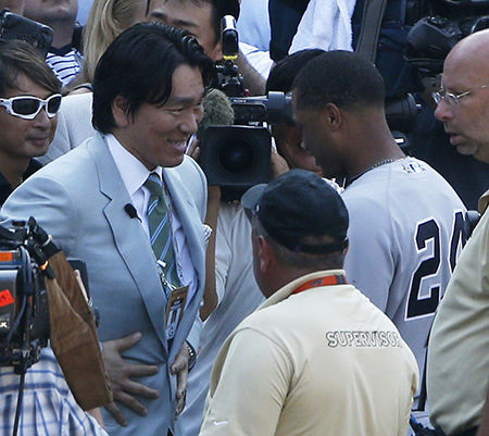 ヤンキース時代に共にプレーし、最後のオールスターに望むヤンキース・リベラと固い握手を交わす松井秀喜氏=シティ・フィールド(撮影=大橋小太郎)